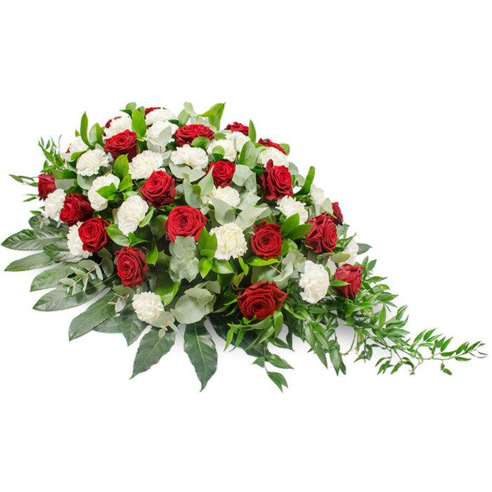 Show your heartfelt sympathy with our Refined Remembrance Floral Arrangement. This elegant bouquet features a beautiful mix of red roses, white carnations, and vibrant greenery, carefully arranged to honor and remember your loved one.