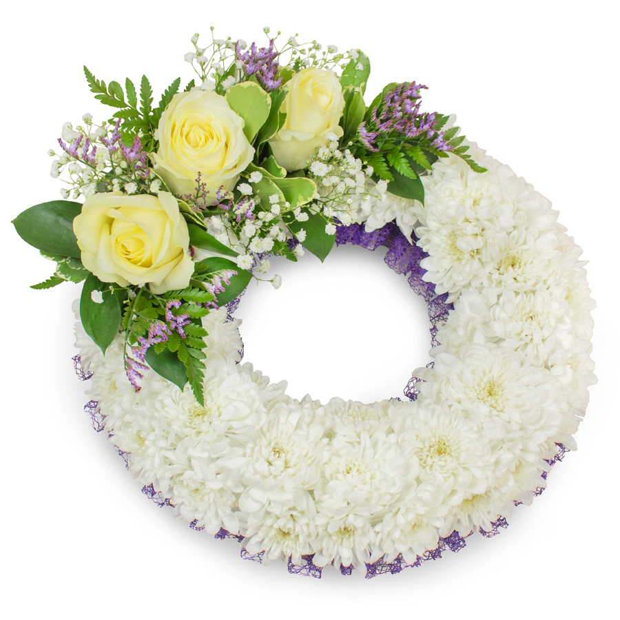 When it is time to say your last goodbye to someone very close to your heart, this lovely floral tribute made of white chrysanthemums, roses, gypsophila and statice flowers is perfect for expressing your heartfelt sympathy and love.