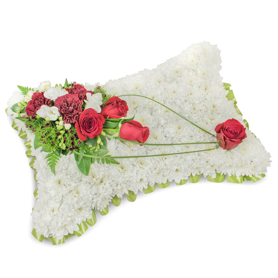 Express heartfelt sympathy with the Sincerest Sentiments Cushion, a beautifully handcrafted floral tribute from Flowers Reigate. This elegant funeral cushion features a soft base of white chrysanthemums, thoughtfully accented with rich red roses, white freesias, dark red carnations, dianthus and bear grass for a graceful, refined finish. Perfect for funerals, memorials or to send condolences, this cushion tribute is designed to convey comfort, respect and sincere remembrance. Expertly arranged by our skilled florists in Reigate, each design is created fresh using premium, long-lasting blooms, with careful attention to detail and balance of colour and texture. Approximate dimensions are 45cm (18") in length, 60cm (24") in width and 12cm (5") in height, making it an ideal size for display at the service. Roses may arrive with protective guard petals to ensure they reach their destination in perfect condition; simply remove the outer petals before displaying. As some flowers are seasonal, we may substitute blooms with similar colours and equal or higher quality to maintain the overall style and sentiment. Offering reliable local service and prompt delivery across Reigate and surrounding areas, Flowers Reigate ensures your sympathy flowers arrive with care and on time. Order this classic white and red funeral cushion online today to send a gentle, dignified message of support when words are not enough.